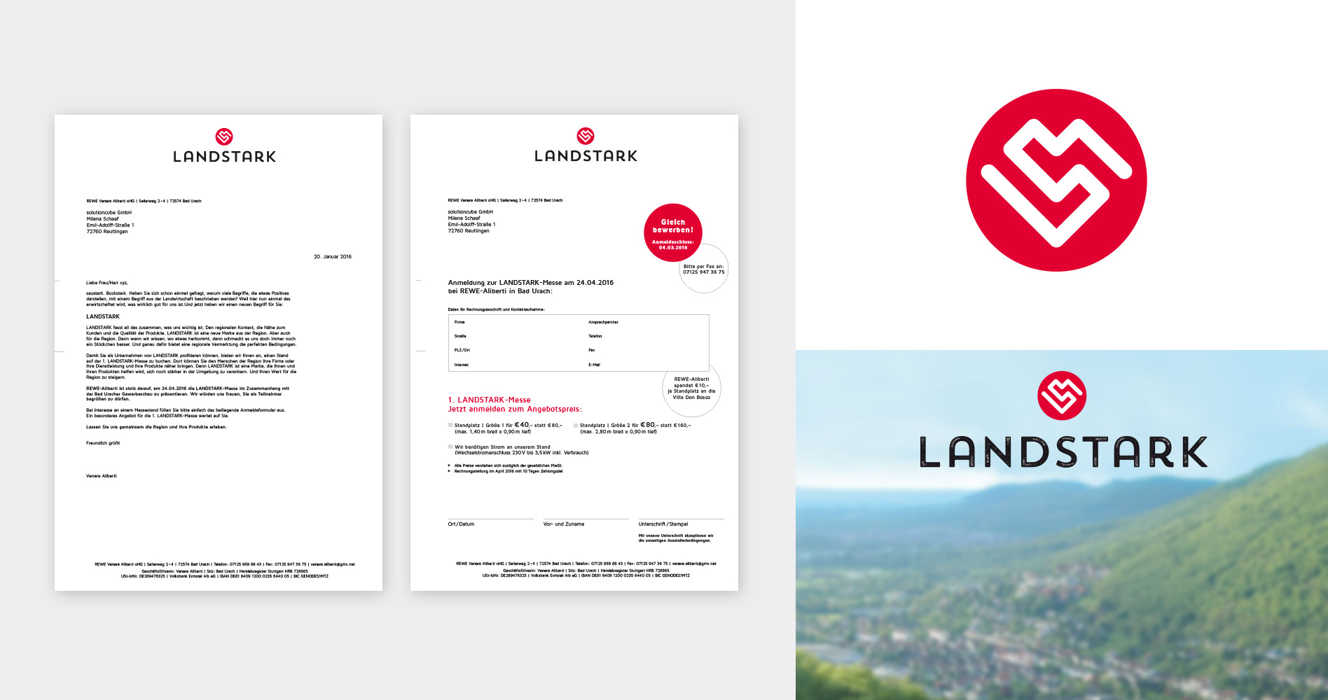eine Wort-Bild-Marke, den Briefbogen und ein Messe-Anmeldeformular.